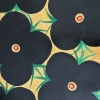 This painting is created in the style of decorative abstractionism and impresses with its bright graphic expressiveness. The composition features large black flowers with rounded petals that effectively contrast with the shiny golden background. The centers of the flowers are decorated with small round elements with a red ornament, adding depth and a sense of volume.