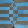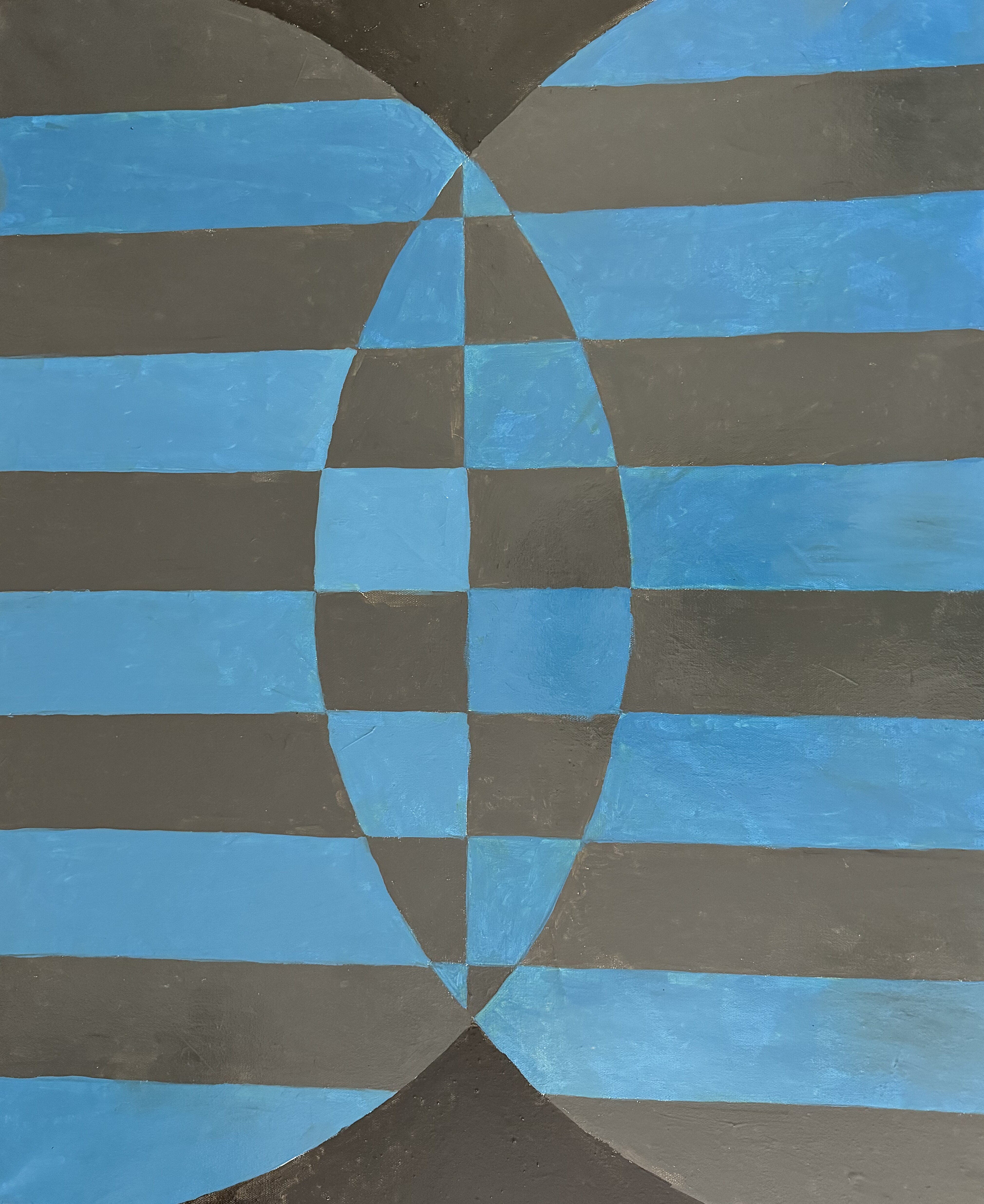 This painting is created in an abstract style, based on geometric shapes and symmetrical patterns. The composition includes alternating black and blue stripes that intersect, creating the illusion of volume and dynamic movement. In the center of the work stands out an elongated oval figure, divided into squares and triangles, adding dynamics and visual balance to the image.