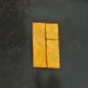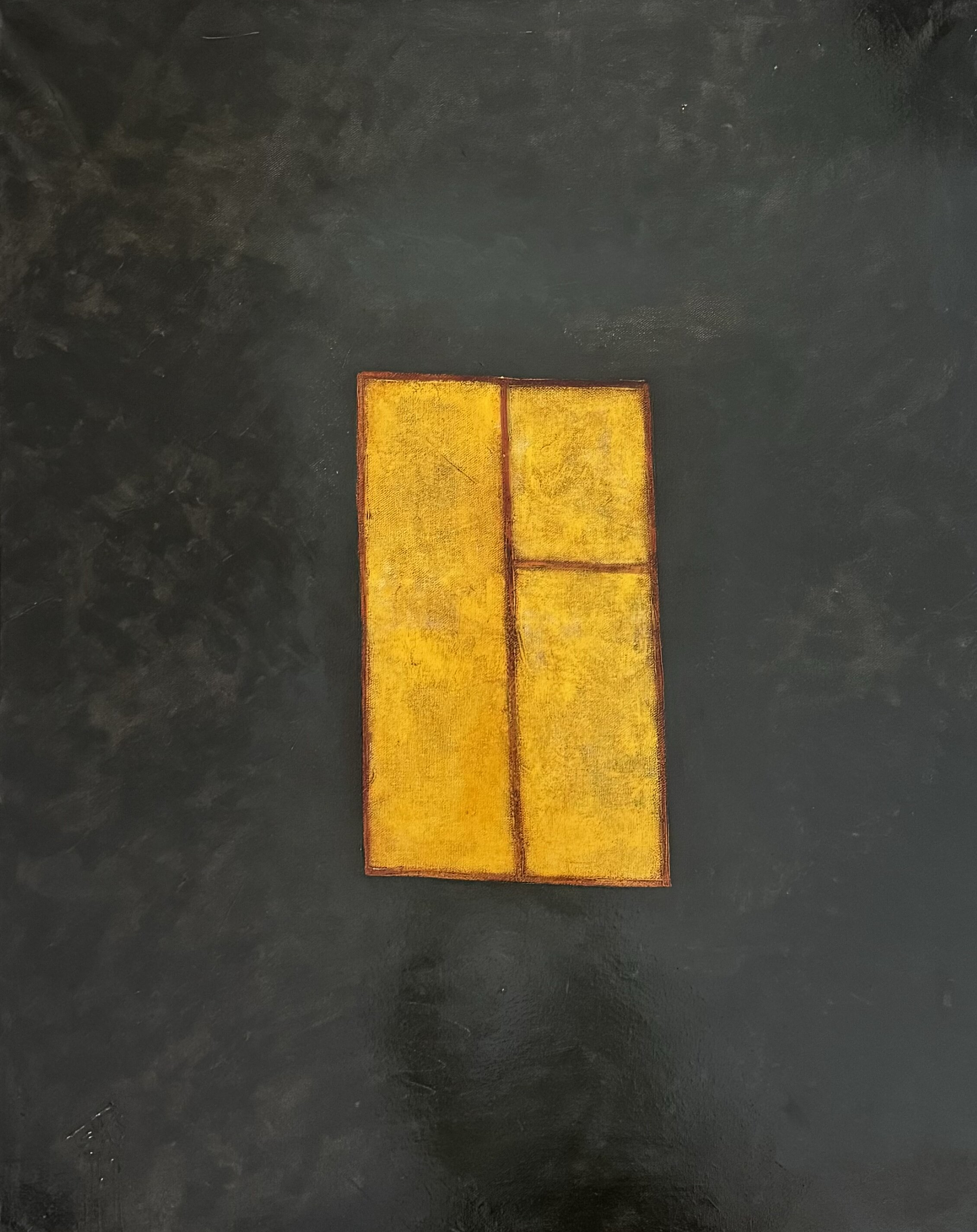 The painting features an abstract composition with a geometric figure resembling a window in the center. It is done in warm orange-yellow tones with a light texture, which gives it a feeling of warmth and light. This figure creates a bright contrast with the dark background, which has a muted and textured surface, evoking associations with transparency.