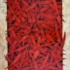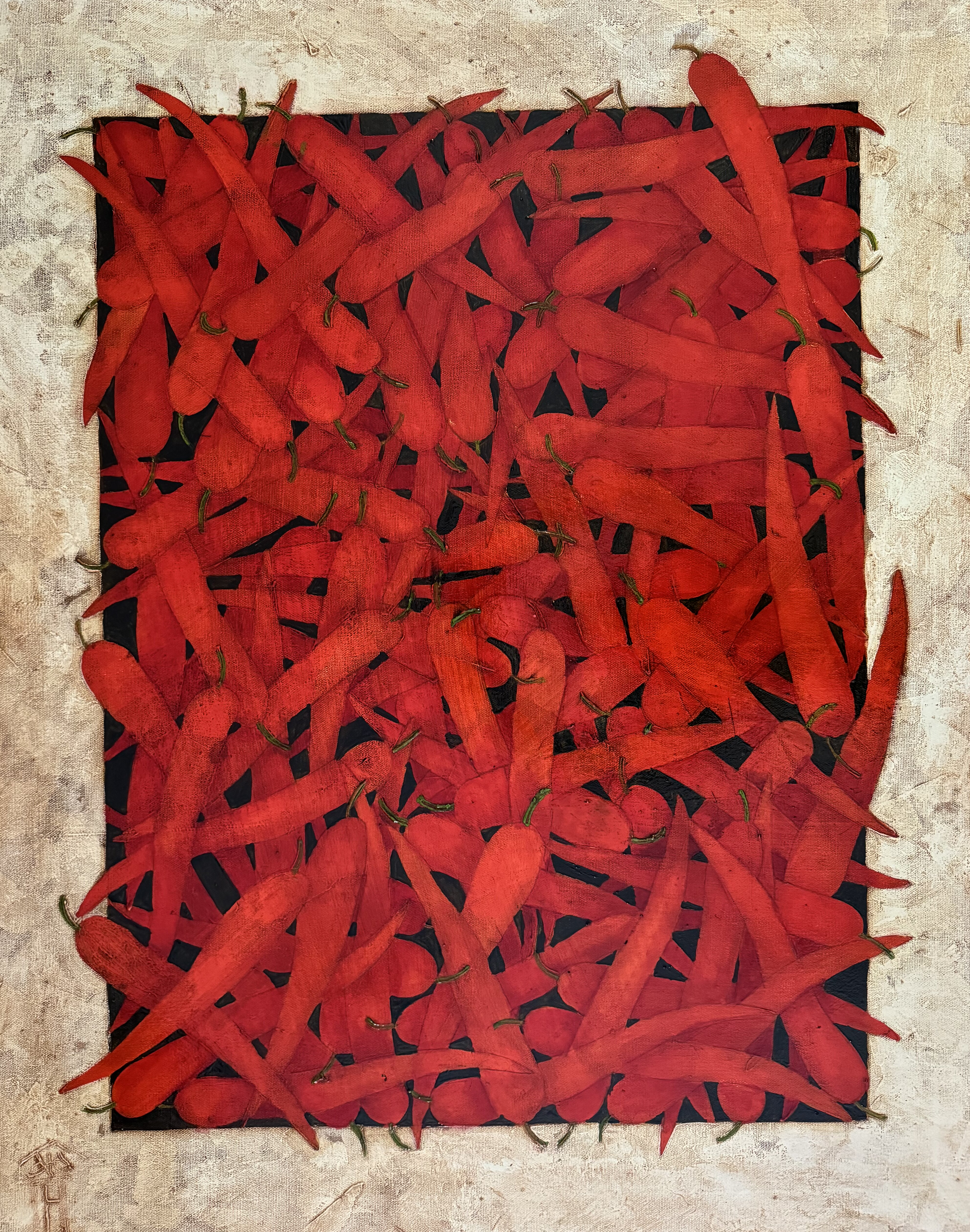 The painting depicts bright red hot peppers, scattered freely against a deep black rectangle framed by a light textured frame. The strong contrast between the rich red of the peppers and the dark background creates a striking visual composition that conveys an atmosphere of spice and passion.