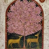 In the lower part of the image, you can see two golden antelopes, gracefully standing on either side of the tree. Their poses are graceful and harmonious, which gives the picture a sense of symmetry and balance. Green grass spreads around them, adding liveliness and naturalness to the composition.