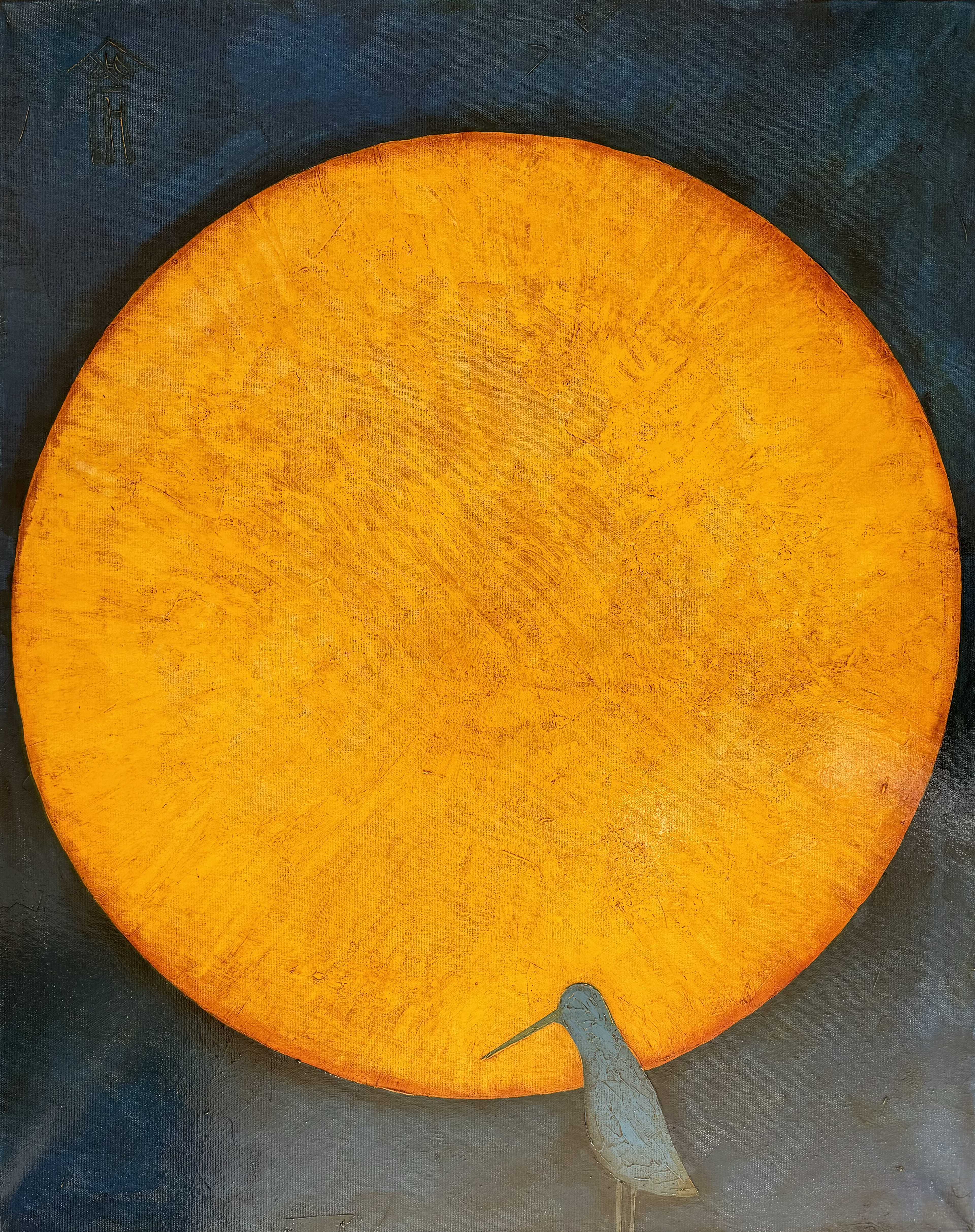 At the bottom of the painting is an elegant blue bird, seemingly frozen in a moment of admiration before the shining circle. Its refined silhouette and beak extended towards the disk give the scene a sense of reverence and awe.