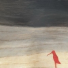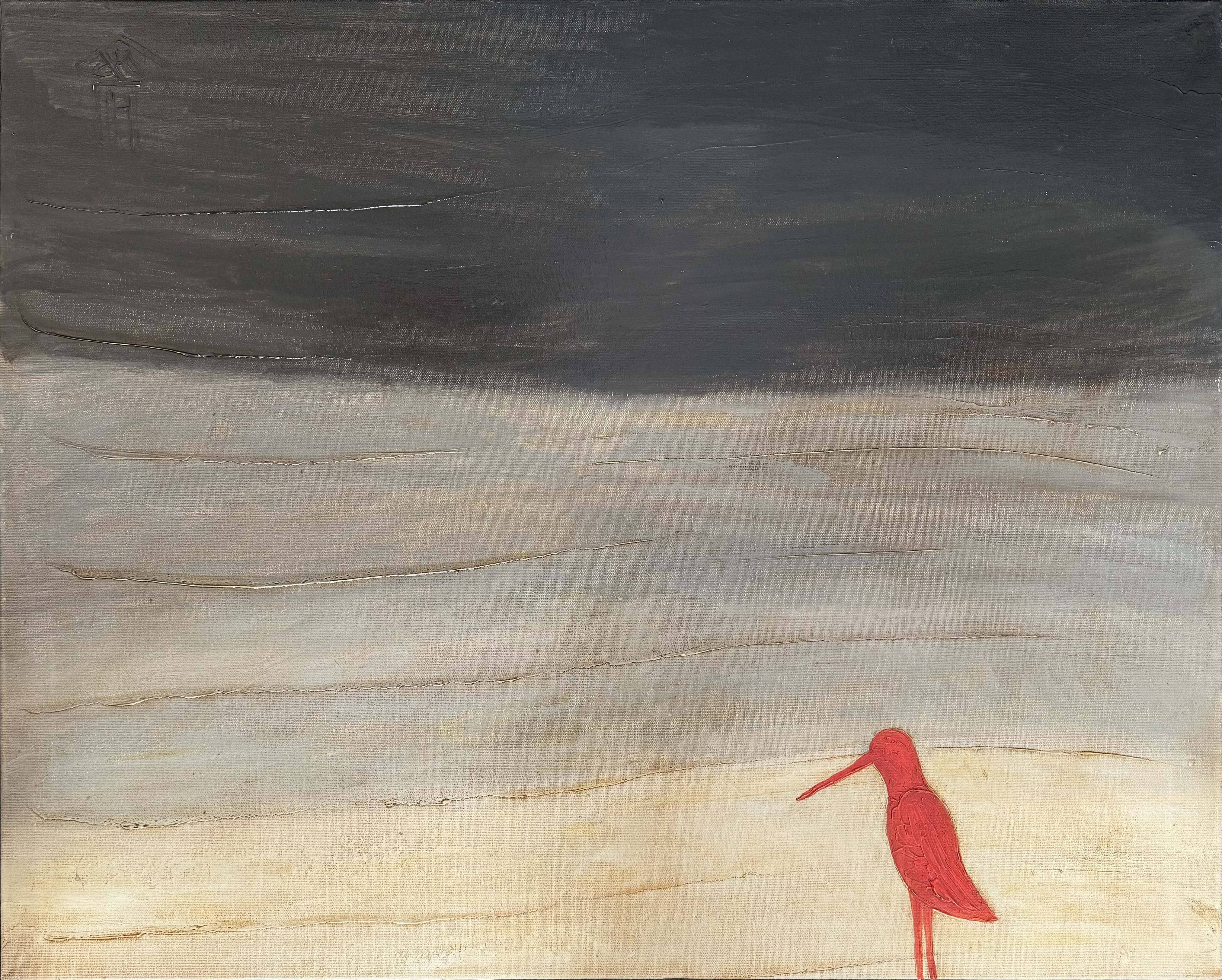 The background of the painting resembles natural textures - sand, sky and water, creating an atmosphere of infinity and freedom. The gradient, moving from darkness to light, can convey the change of day and night, deepening in thought and the transition from anxiety to calm. The red bird, appearing in sharp contrast to the calming color scheme of the background, becomes a bright accent of the composition - it attracts the eye and symbolizes loneliness, searches or hope.