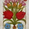This painting is done in a decorative style and is an exquisite composition of stylized flowers in a vase. The focus is on two large red flowers surrounded by buds and bright green leaves. Above them are graceful pink-purple flowers with golden centers, and at the bottom of the painting are two blue flowers with dark centers. All the elements are organized into a symmetrical composition, giving the image a sense of harmony and balance.