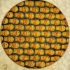 The painting depicts a circle with an ordered pattern in the center consisting of many fish-shaped figures. These fish are made in yellow-gold shades, decorated with bright red stripes, and their eyes are marked with white and black dots, which gives the image expressiveness and dynamism. The dark brown background around the fish creates a contrast effect, emphasizing the repeating pattern.