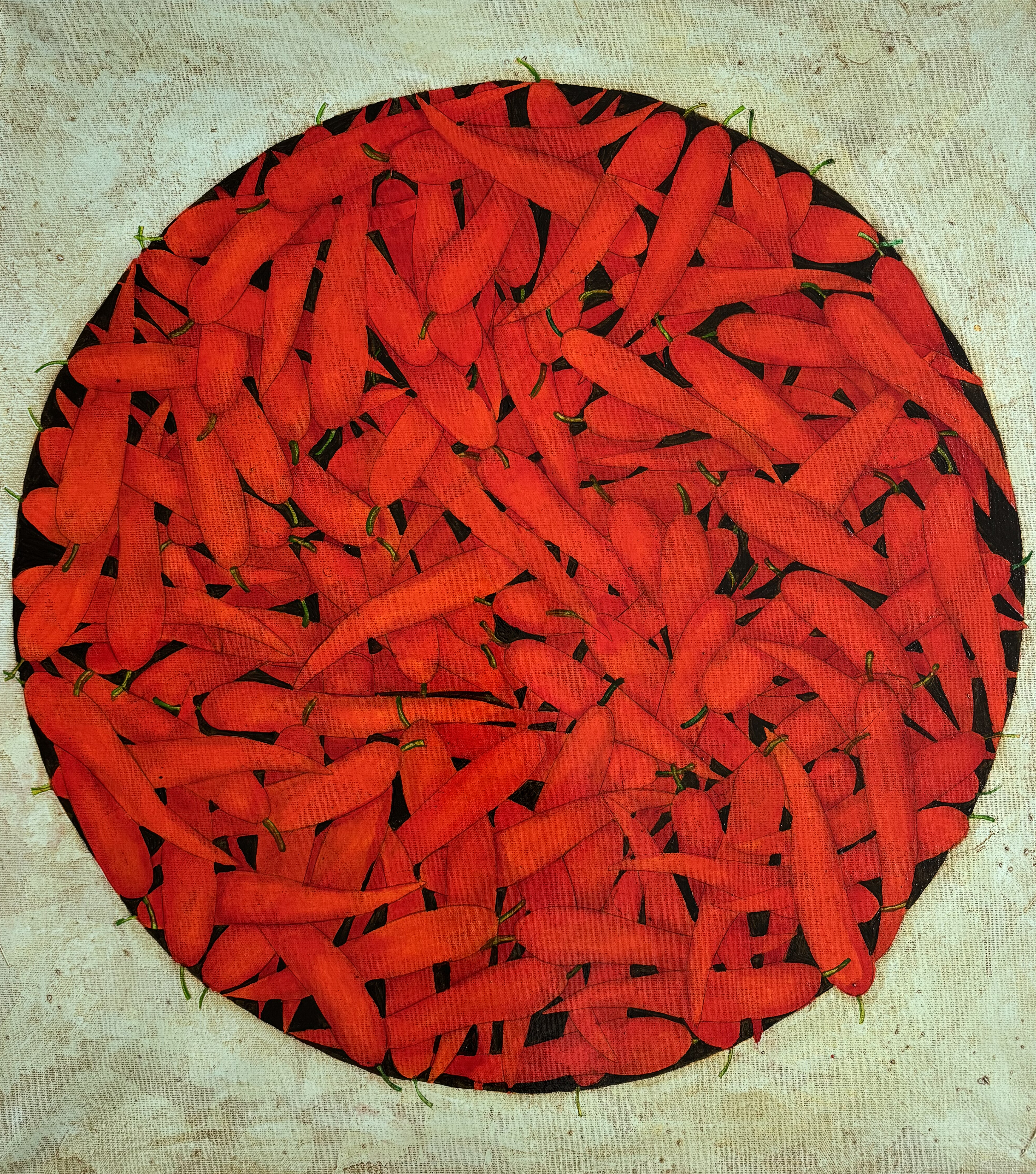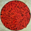 This painting features a circular composition, richly filled with red hot chili peppers. The bright and vibrant red color enhances the feeling of warmth, fire and dynamic movement. The peppers are randomly placed, but together they form a harmonious whole, creating an effect of rich texture and depth.