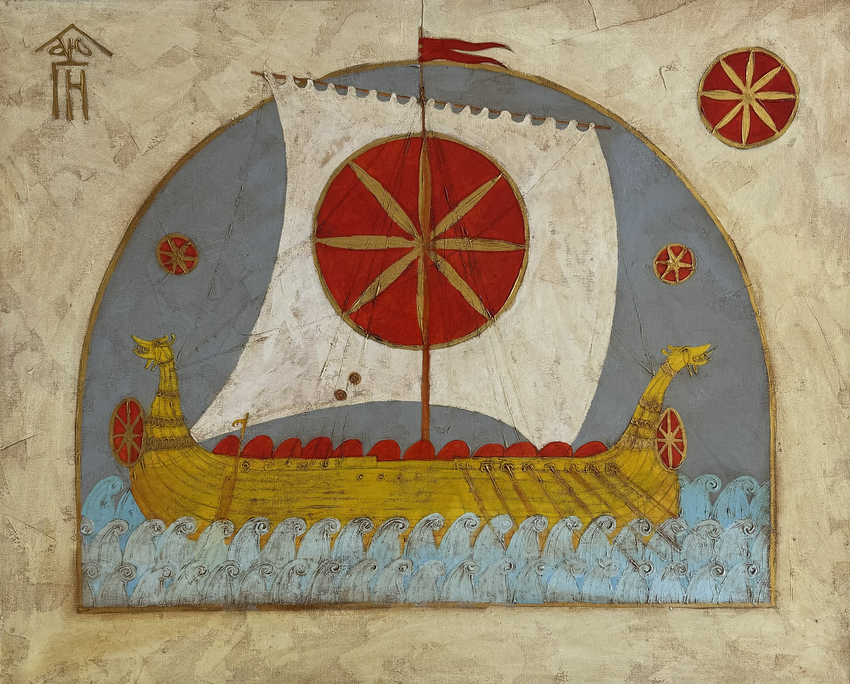 The painting depicts a stylized drakkar, a famous Viking ship, rushing through raging waves. The vessel, executed in golden tones, is decorated with carved dragon heads on the bow and stern, which emphasizes its legendary status. A large white sail with a red symbol reminiscent of a solar sign or rune flutters above the ship.