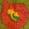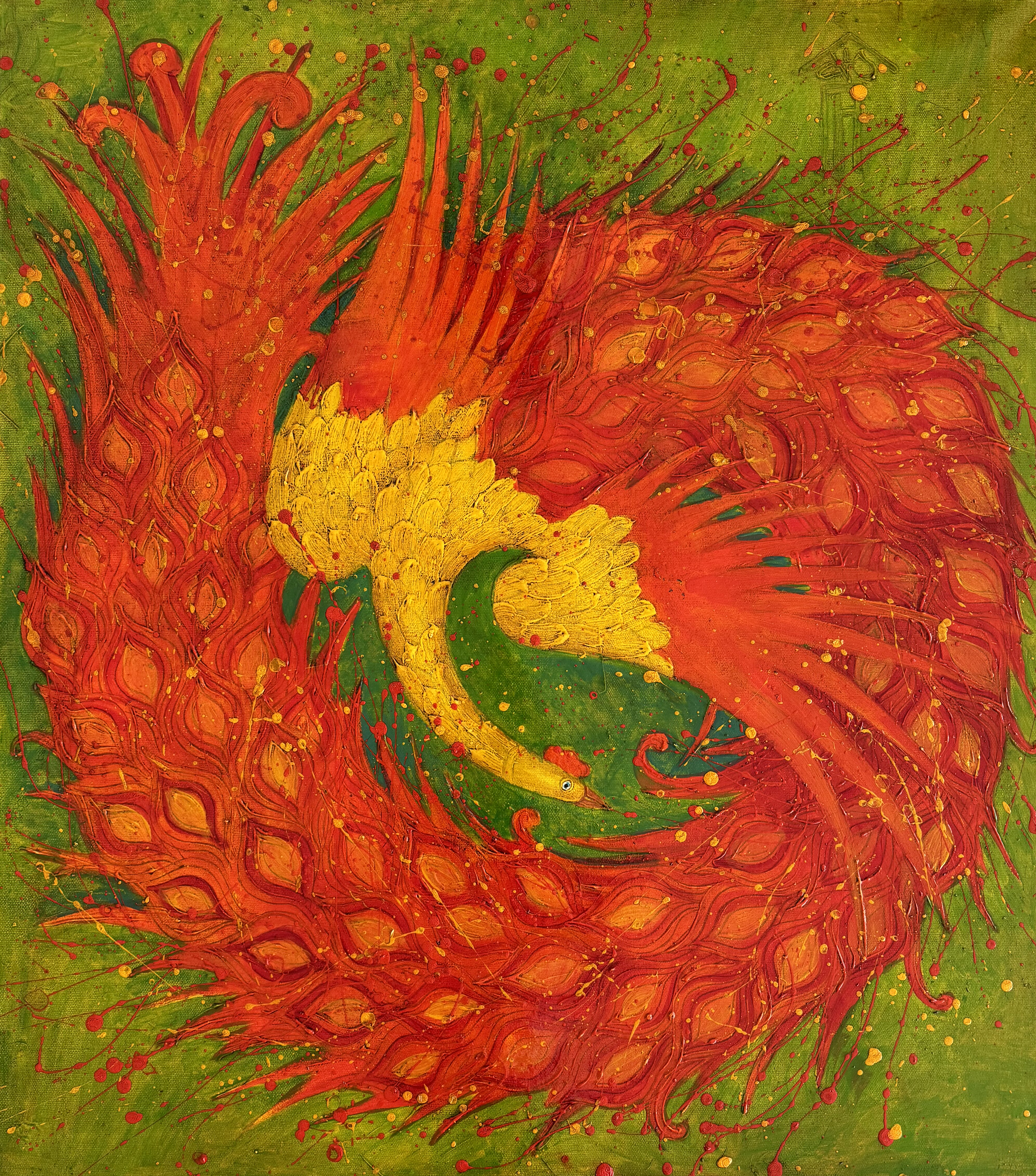 This painting depicts a magnificent phoenix surrounded by a fiery vortex. Its body glows with vibrant orange and red feathers reminiscent of blazing flames, while its head and chest stand out in golden yellow hues, symbolizing light and a new beginning. The background of the painting is done in green tones, creating contrast and emphasizing the unity of the fiery nature with the surrounding world.