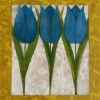 The painting depicts three bright blue tulips with green leaves, arranged in a neat row. The background surface is done in warm golden-yellow tones, and the central part, where the flowers are located, has a light texture reminiscent of aged paper or cracked ceramics.