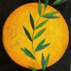 This artwork embodies a harmonious combination of natural and cosmic elements. In the center of the composition is the moon, made in warm golden-yellow shades with a textured surface. In the background of the moon, a green plant stem with oblong leaves gracefully extends, which contrasts with the dark space around.
