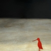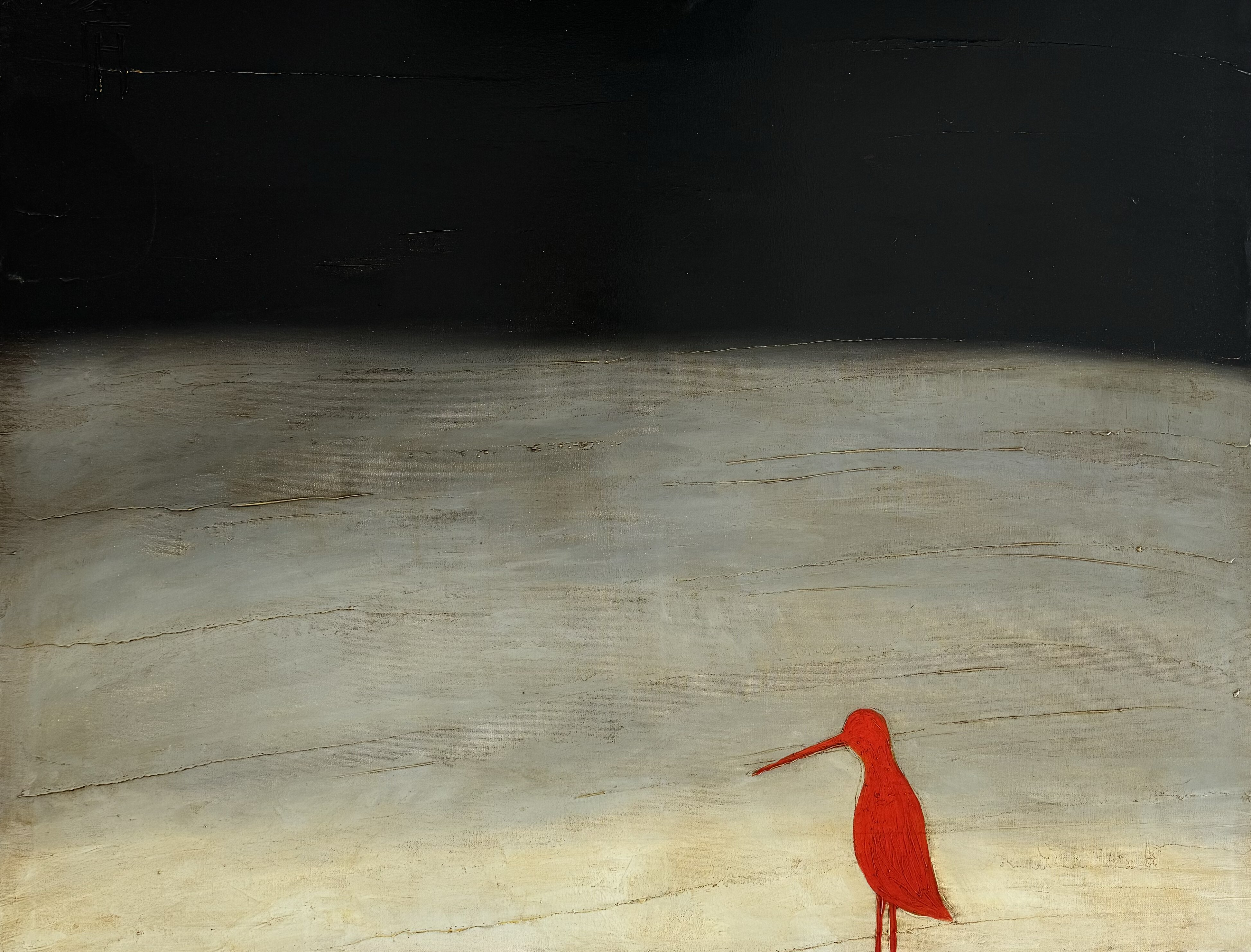 The background of the painting resembles natural textures - sand, sky and water, creating an atmosphere of infinity and freedom. The gradient, moving from darkness to light, can convey the change of day and night, deepening in thought and the transition from anxiety to calm. The red bird, appearing in sharp contrast to the calming color scheme of the background, becomes a bright accent of the composition - it attracts the eye and symbolizes loneliness, searches or hope.