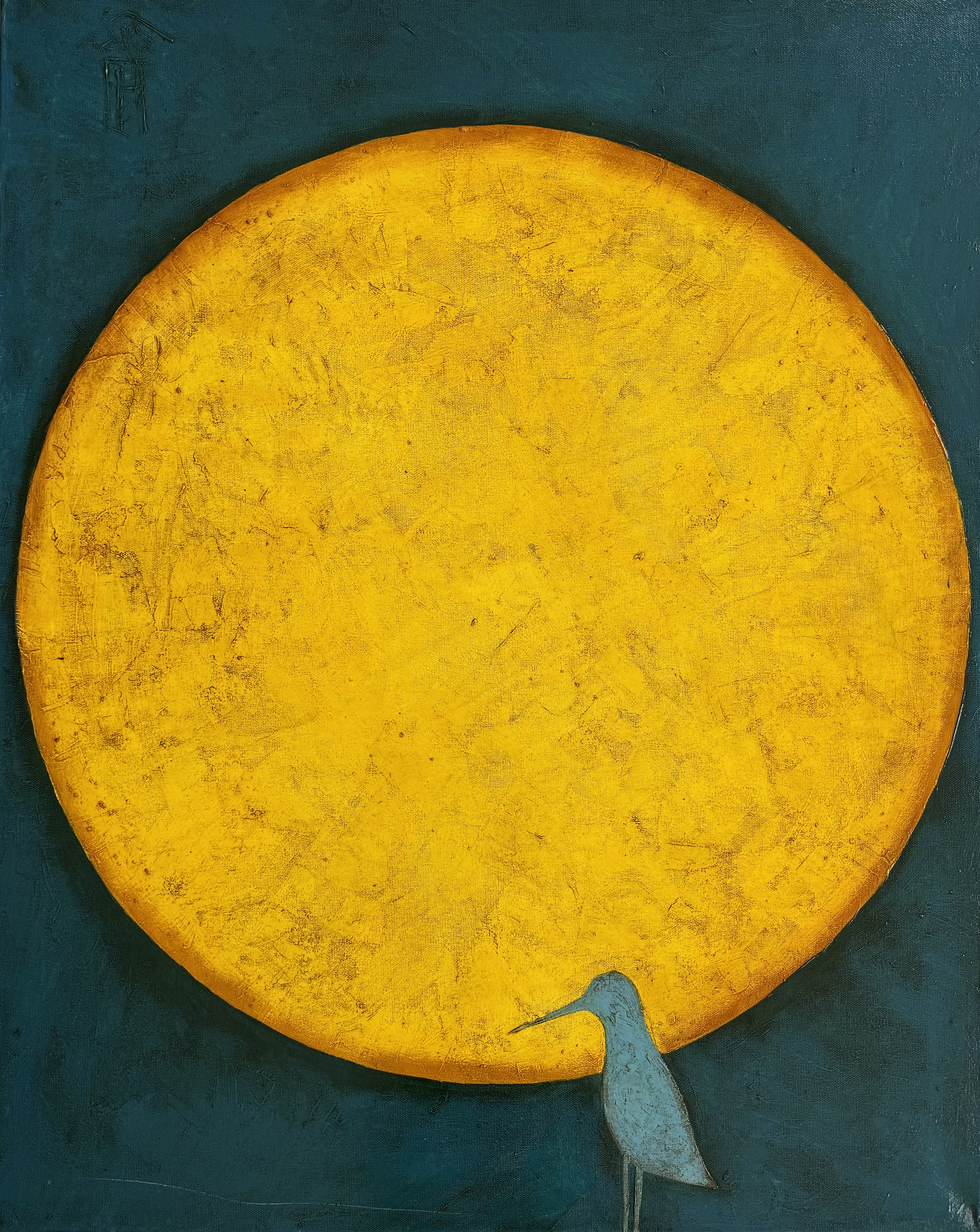 At the bottom of the painting is an elegant blue bird, seemingly frozen in a moment of admiration before the shining circle. Its refined silhouette and beak extended towards the disk give the scene a sense of reverence and awe.