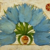 This is a decorative painting depicting an exquisite bouquet of large blue flowers arranged in a small vase. These flowers, with their smooth, rounded shapes and pointed petals, radiate a rich sky-blue color that contrasts vividly with the background, which is done in warm beige tones with an aging effect.