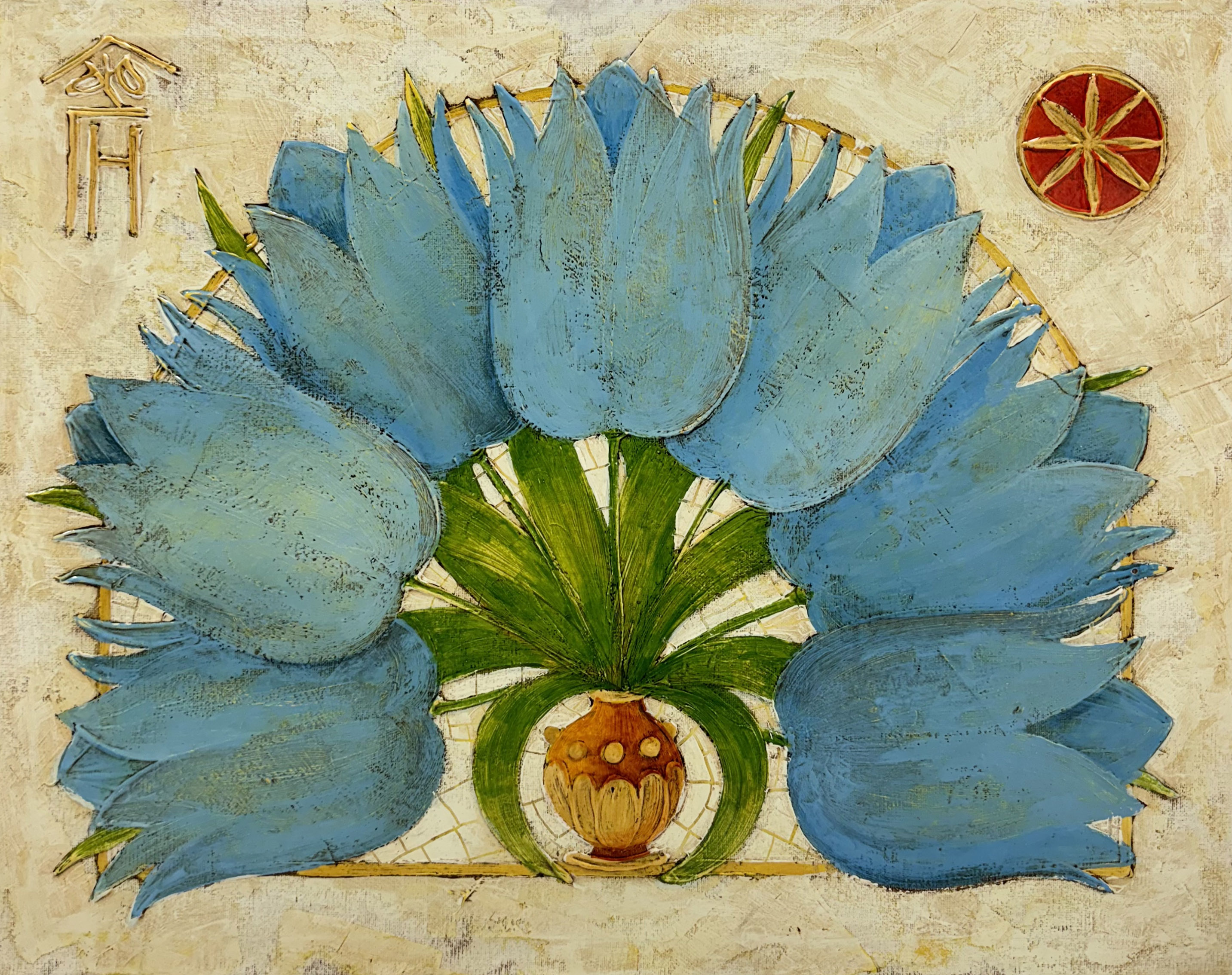 The style of the painting draws inspiration from ancient and oriental traditions, and the technique of execution creates a fresco effect. The textured surface, warm color palette and subtle ornamentation give the work an aura of antiquity, filled with deep symbolism and refined aesthetics.