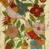The painting depicts two symmetrically positioned birds with bright plumage in warm red-pink shades. They are perched on branches that grow from an elegant decorative vase. Flowers in delicate lilac and yellow tones bloom around these birds, next to green leaves and clusters of bright red berries.