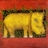 This painting is executed in a bright and expressive style with elements of primitivism. The canvas depicts an unusual yellow hippopotamus with attractive blue eyes. The shape of the animal is somewhat simplified and stylized, and its paws are decorated with curls reminiscent of bracelets or ornaments. The hippopotamus looks as if it is emerging from a dark rectangle, which is surrounded by lush green plants.