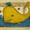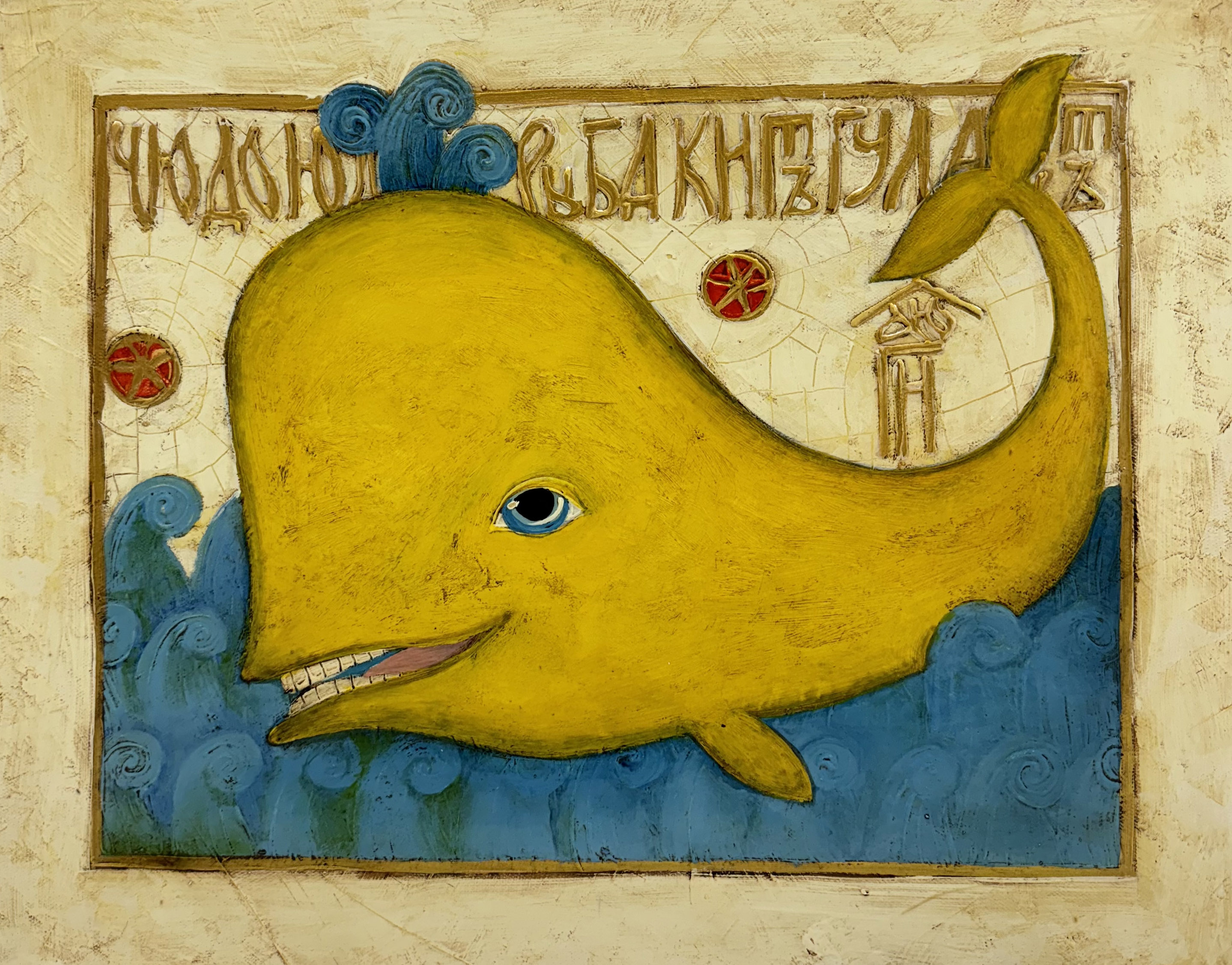 This painting depicts a fairytale image of a smiling yellow whale swimming on the waves. The background is made in the style of old parchment, decorated with decorative elements and ancient inscriptions. The whale appears before the viewer with a good-natured and slightly sly expression on his face, and his tail is playfully raised up. The blue waves and splashes of water thrown out by the whale perfectly match his golden body, creating an atmosphere of a kind and inquisitive fairy tale. This painting is filled with warmth, humor and magic, like an illustration of myths and legends.
