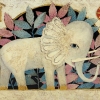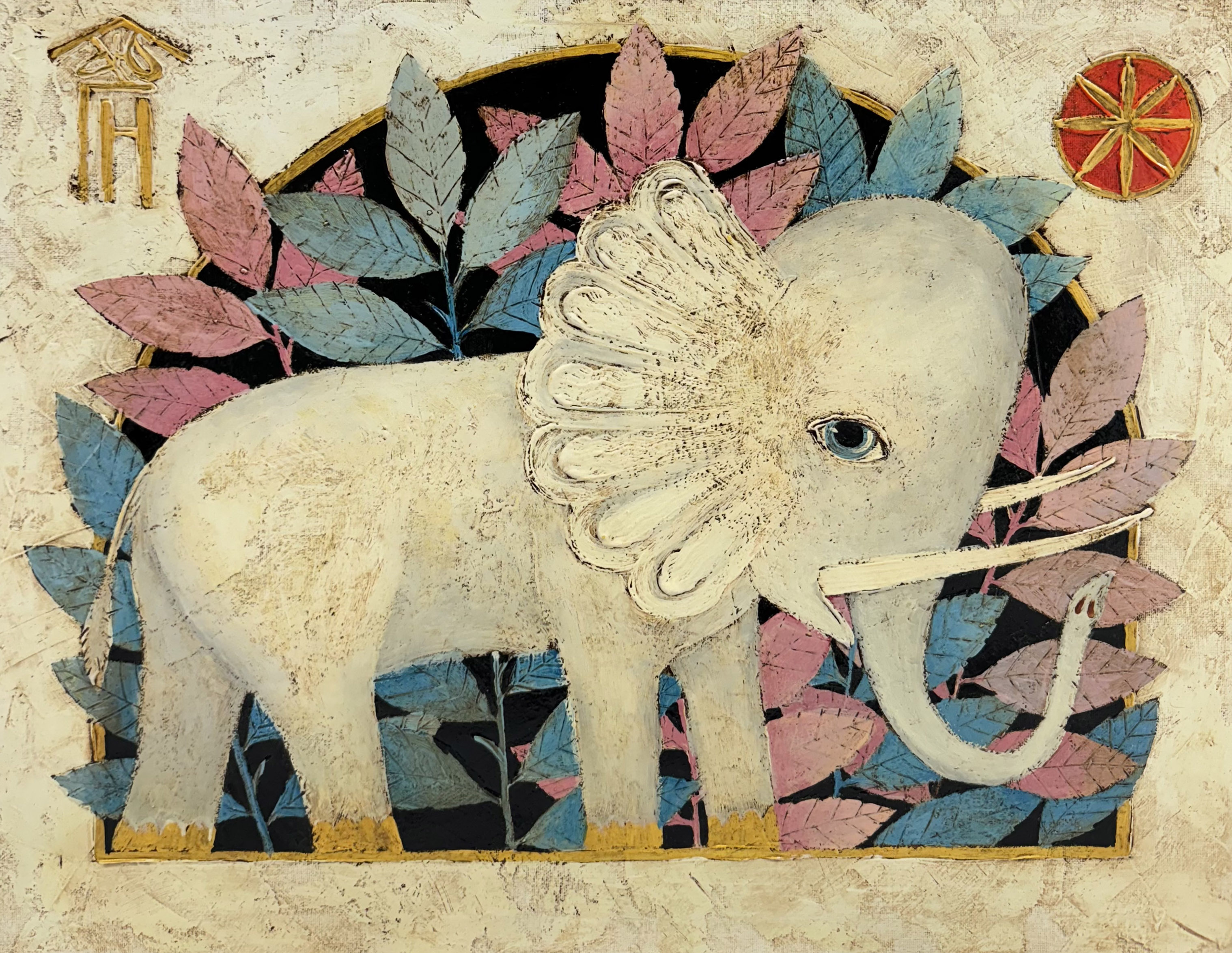 The painting titled "Elephant" depicts a fabulous white elephant in a decorative style. The background of the painting is decorated with large stylized leaves in pink and blue shades, creating a bright contrast. The elephant's head is decorated with an exquisite ornament reminiscent of shells or petals, which gives it a mythical grace.