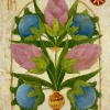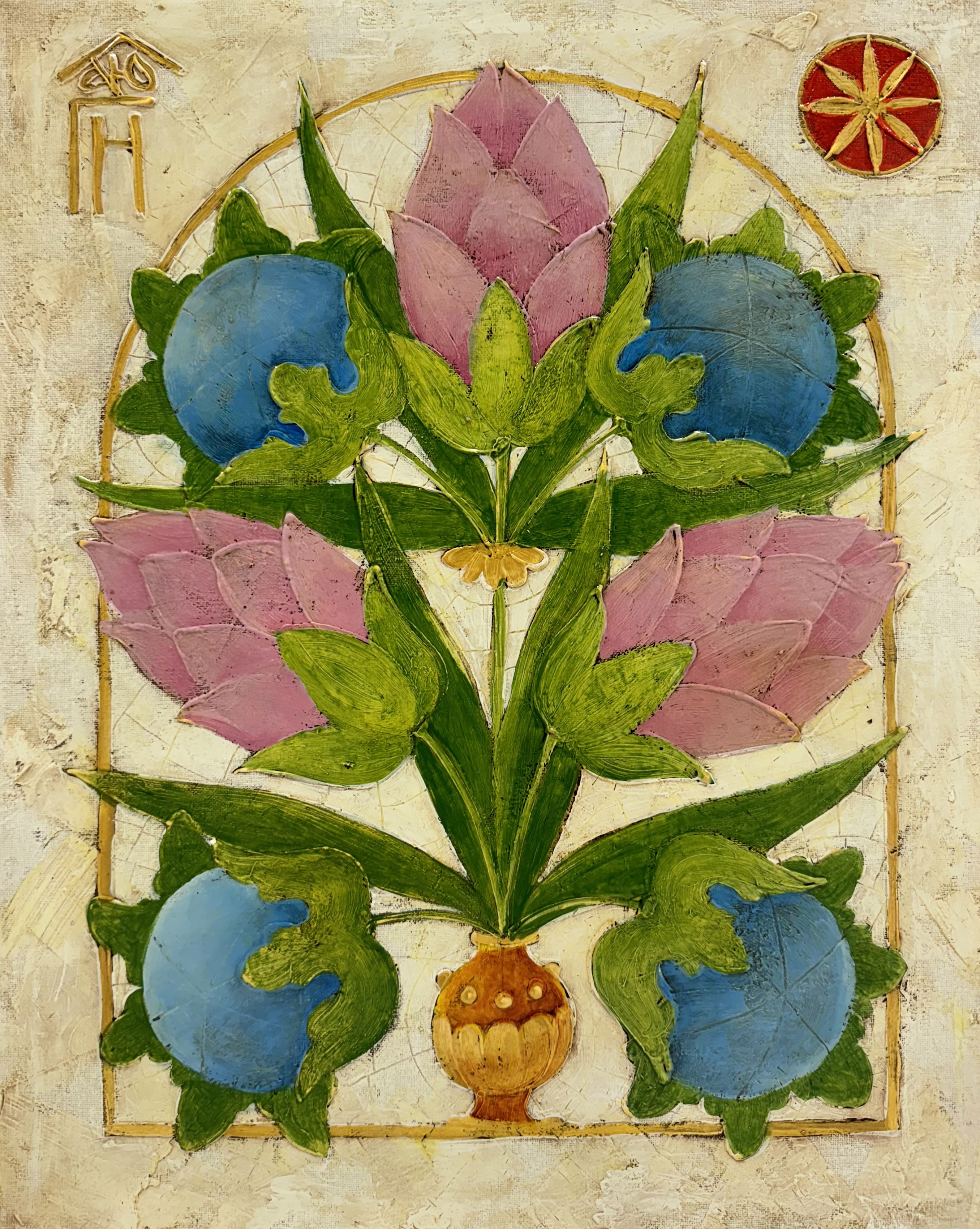 In the center is a stylized flower, from which leaves and buds diverge. The environment of large blue fruits and pink flowers creates a harmonious color composition. A red arched frame with geometric elements frames the drawing, giving it severity and completeness.