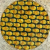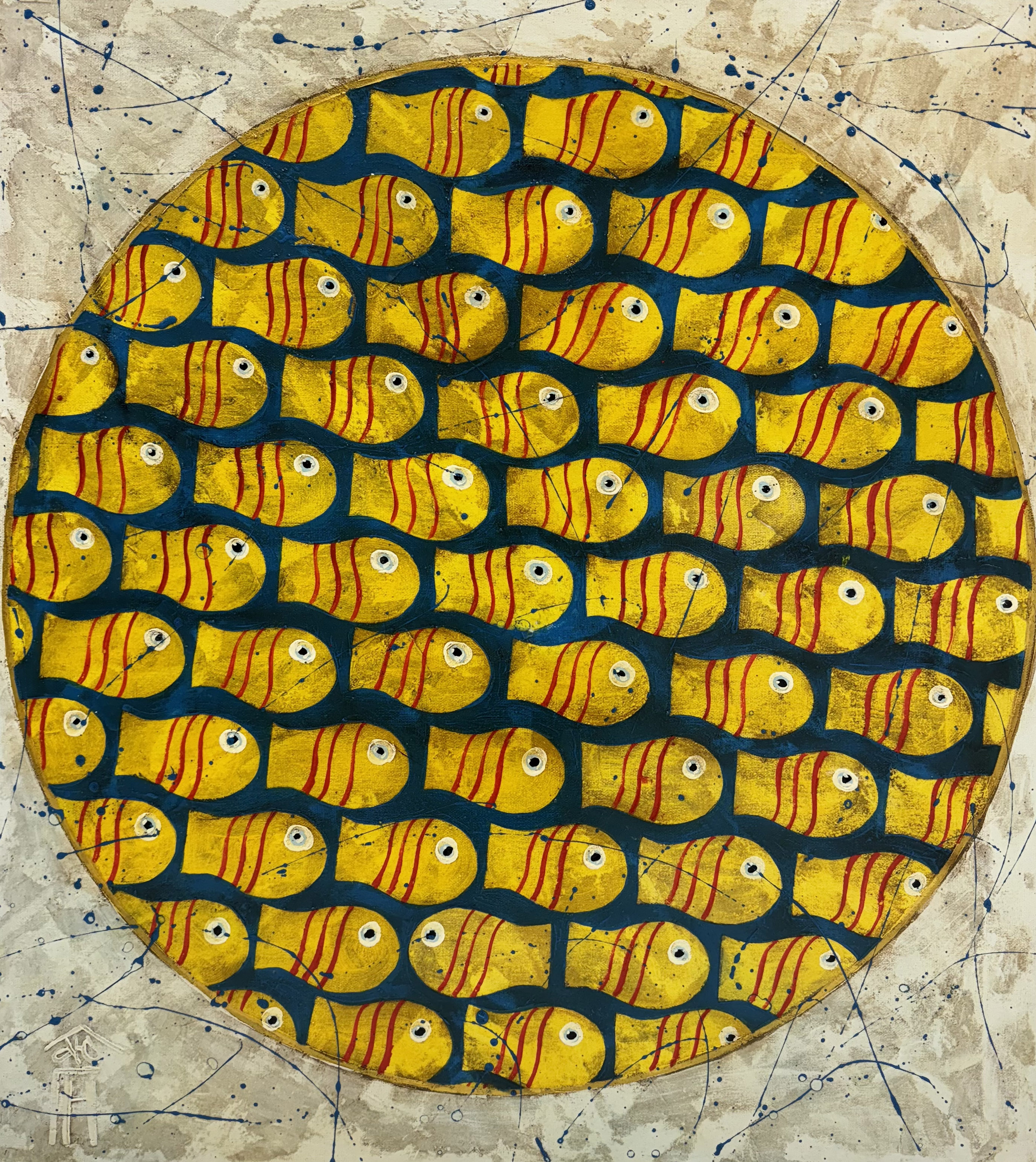 This painting is a unique composition in the style of abstract art. In its center is a circle filled with a dense pattern of yellow fish with bright red stripes. The symmetrical arrangement and the single direction of their gaze create a sense of dynamics and rhythm.