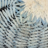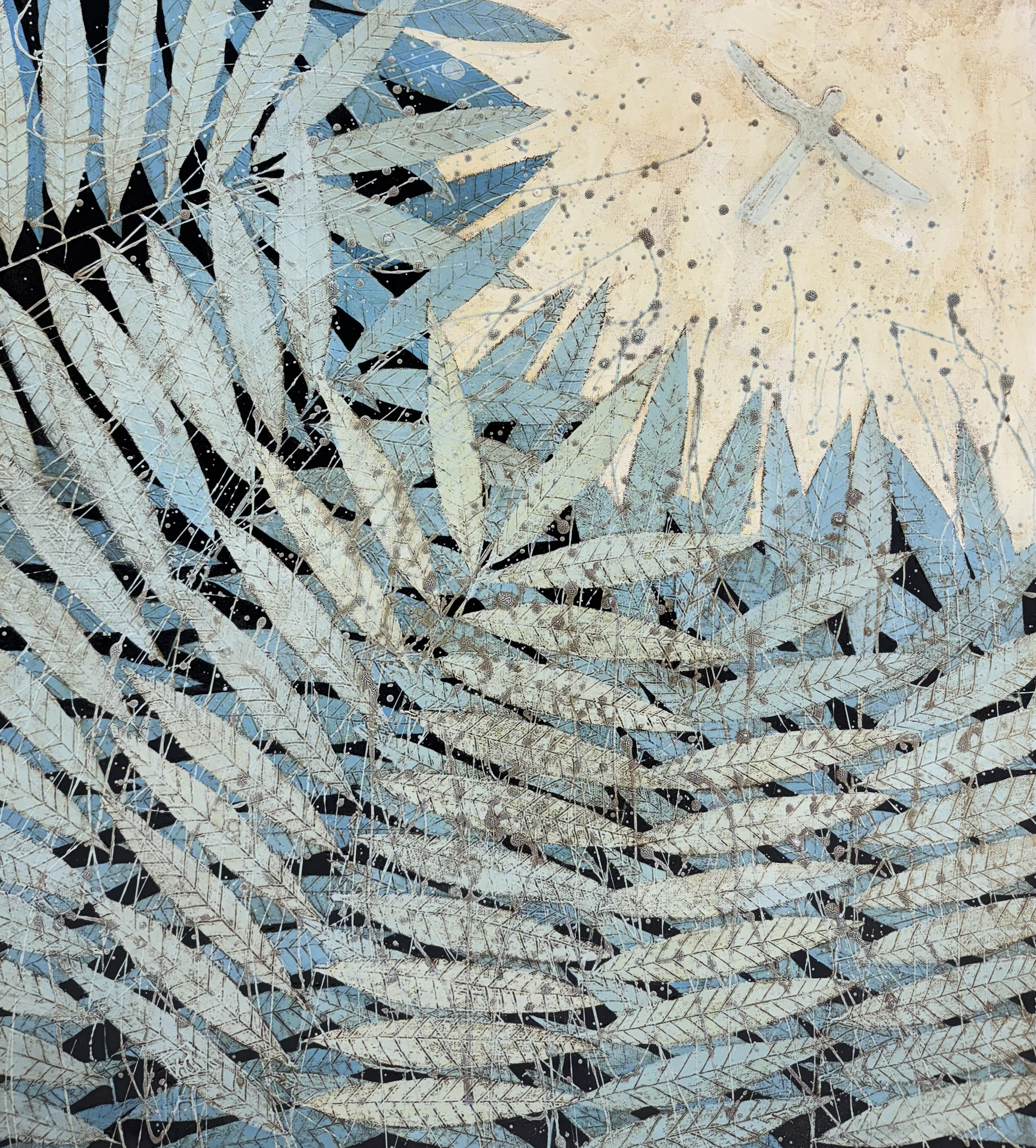 The painting depicts a delicate composition, permeated with natural motifs. In the center stands out a bright space, reminiscent of sunlight or heavenly radiance, where a graceful dragonfly hovers. The canvas is covered with an elegant interweaving of leaves, and soft shades of blue and beige create an atmosphere of lightness and transparency. Fine lines and textures give the work depth and airiness. This work of art conveys a sense of calm and harmony with nature, as well as weightless movement. The painting seems to invite the viewer to immerse himself in a world of silence and light melancholy.