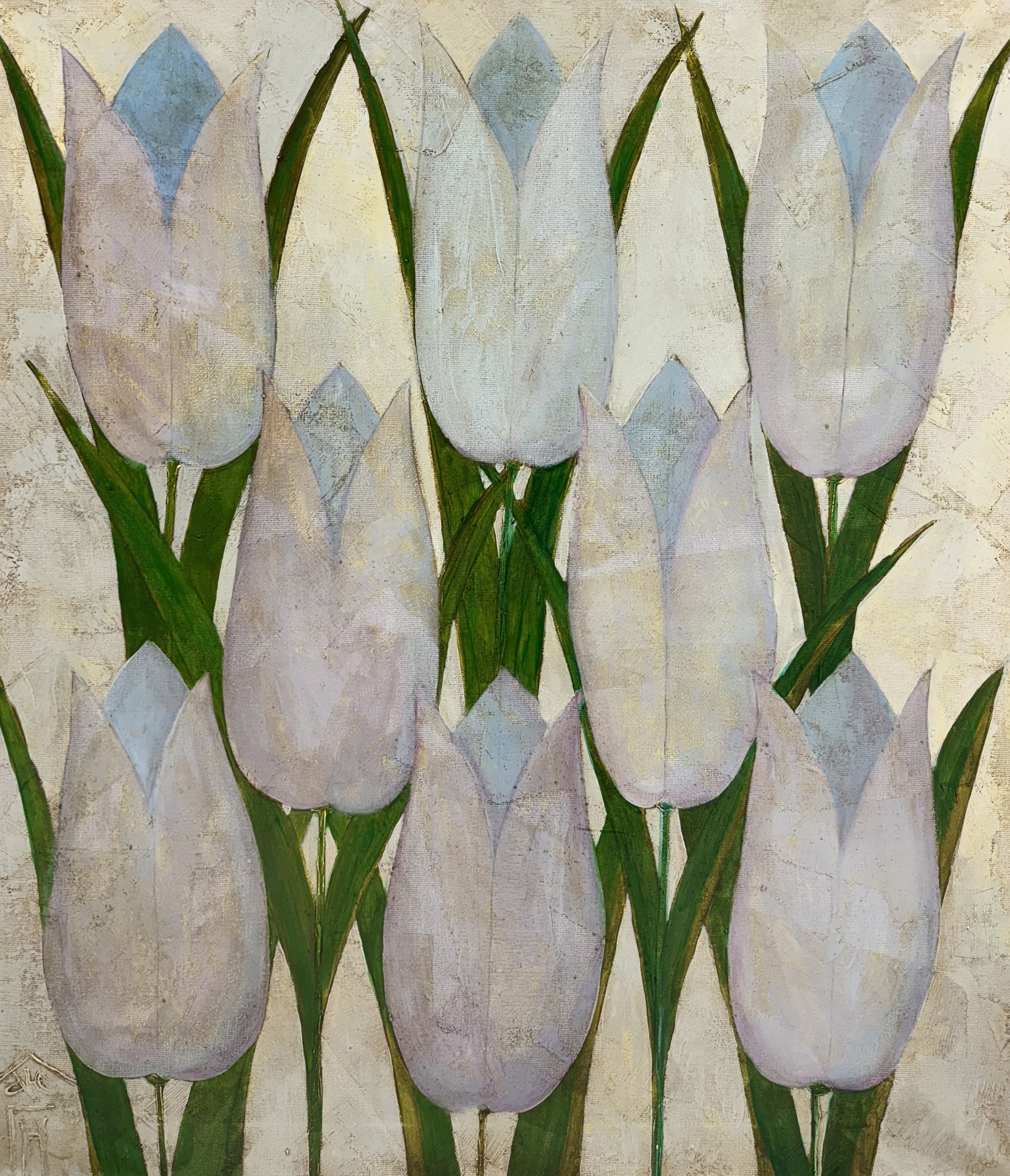 The painting "White Tulips" is an ode to the tenderness and fragile purity of spring. In the foreground is an ensemble of nine snow-white tulips, harmoniously placed next to each other. The author masterfully works with nuances: each bud seems to consist of many transparent, barely perceptible shades of white - from snow-clear to light creamy and grayish halftones. The petals are painted with wide, lively brushstrokes, which creates a feeling of airiness and a little trepidation.