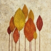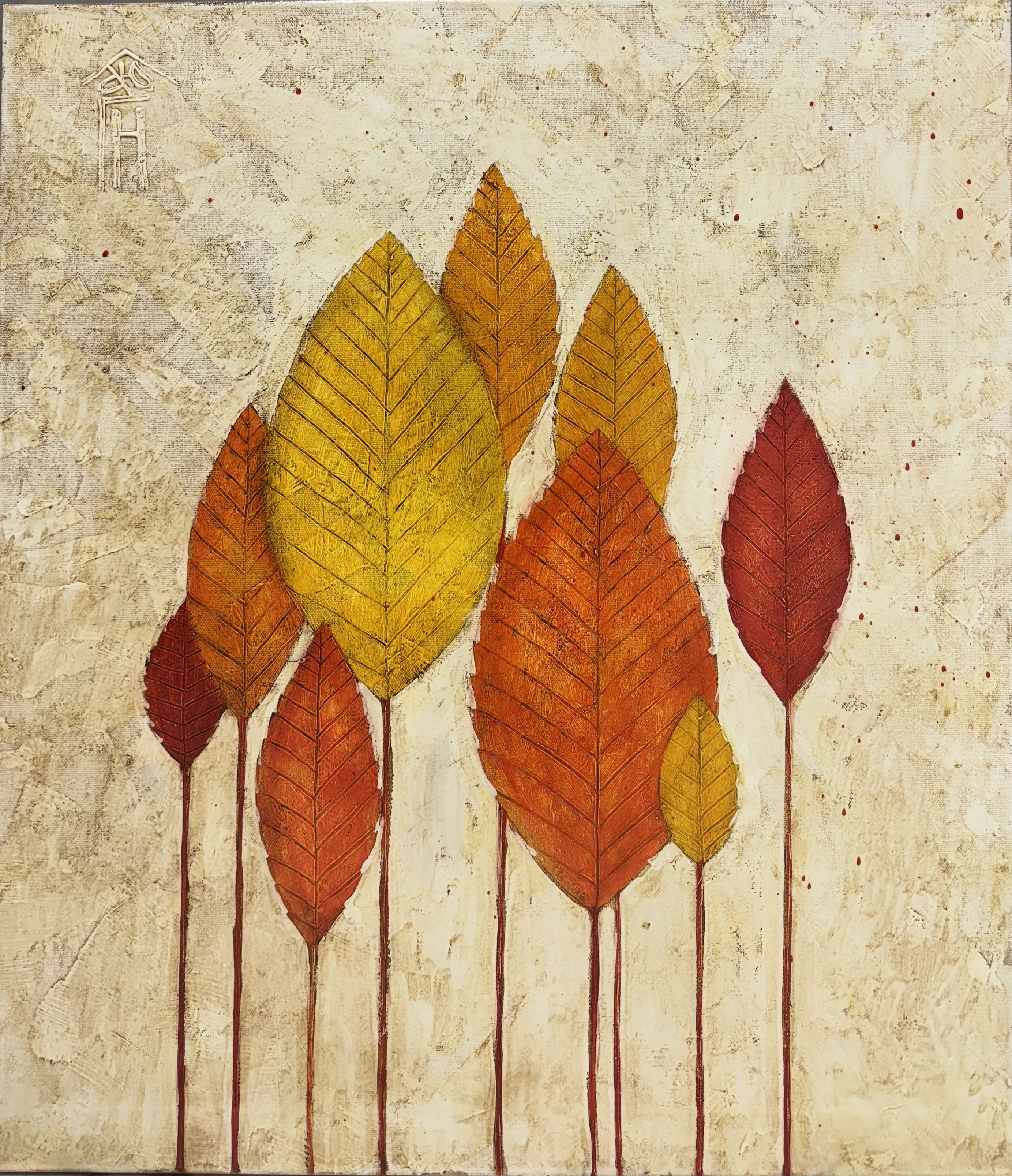 "Autumn Leaves" is an admiration of the beauty of simple seasonal changes. The painting shows a slender group of leaves, as if they have risen into a sprout, executed in warm ochre-yellow, terracotta and crimson shades. The background is light, textured, like old paper or plaster, which gives the work an atmosphere of warm autumn melancholy.