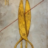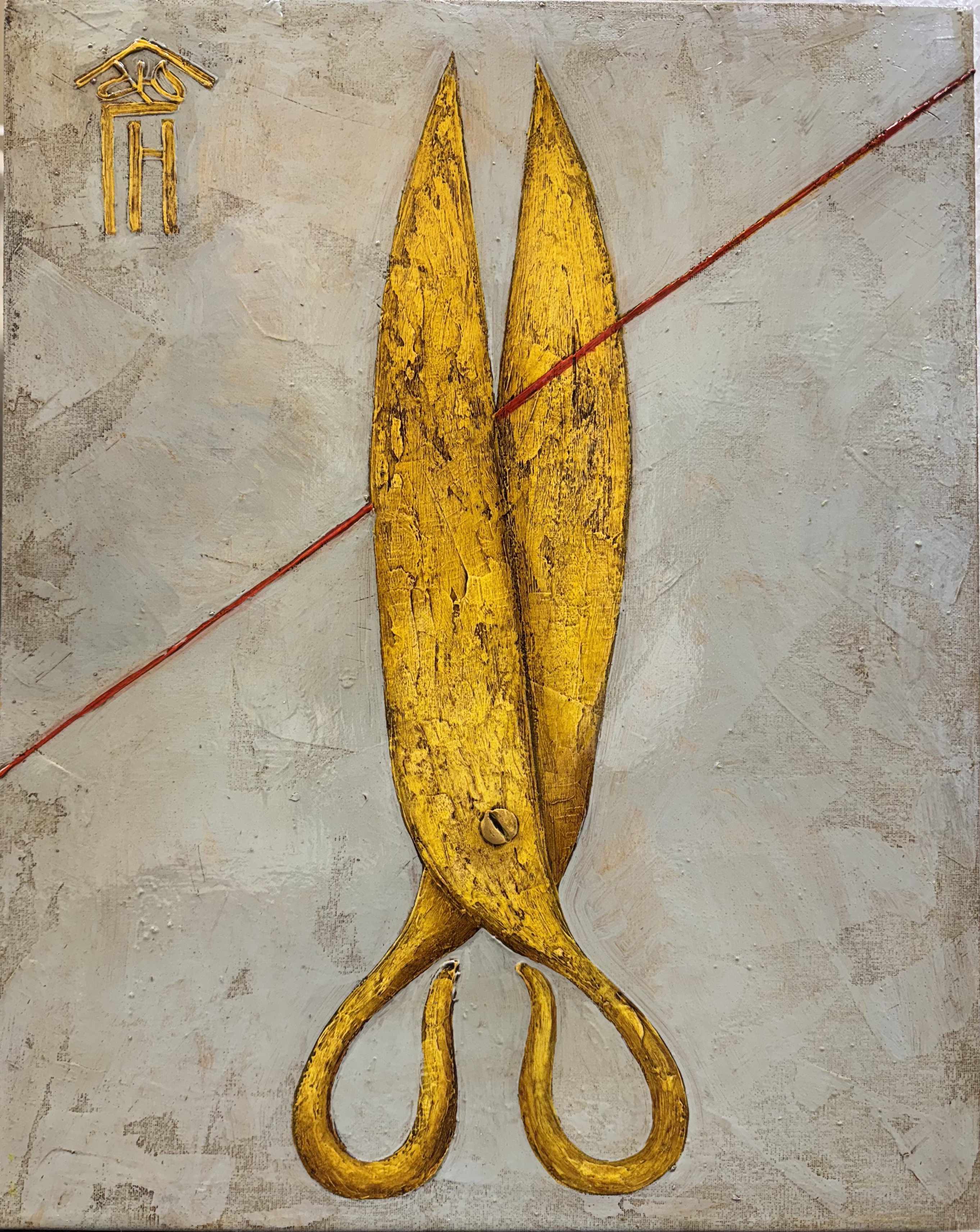 The painting “Scissors and thread” amazes with its laconicism and at the same time deep symbolism. Against the background of a cold, expressive gray color, massive golden scissors – the central object of the composition – clearly stand out. Their blades are directed vertically upwards, and a bright red thread is stretched diagonally across the entire canvas. It seems to connect two halves of the world, but at the same time – it is about to be cut. This technique fills the painting with sharpness and drama, making an ordinary object a symbol of choice, fate, a turning point.