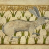 The background of the painting imitates an old fresco: bright grass spots stand out against a predominantly light, as if burnt out by time, background decorated with cracks of craquelure.