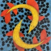 The background is deep blue, generously strewn with large black circles that can be associated with both water ripples or bubbles, and with caviar - a symbol of the continuation of life. These elements help to perceive the composition as a patterned mosaic or a bright scene from a folk epic. The space is filled with a sense of movement, fun, eternal renewal - a pair of fish seem to be in their own world, an indissoluble union, in a continuous dialogue of color and plastic form.