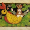 The painting depicts a fairy-tale mermaid with a bright yellow tail, adorned with a crown and a necklace of red pearls. Her hands seem to cut through green waves, surrounding the character with mysterious energy. The mermaid looks straight at the viewer with large blue eyes, on her head is a luxurious crown, emphasizing her royalty. The abundance of decorative elements and rich colors are reminiscent of paintings on wooden lids of old chests, as well as traditional Russian popular prints. The painting combines elements of folklore, naive art and pagan protective symbols.