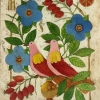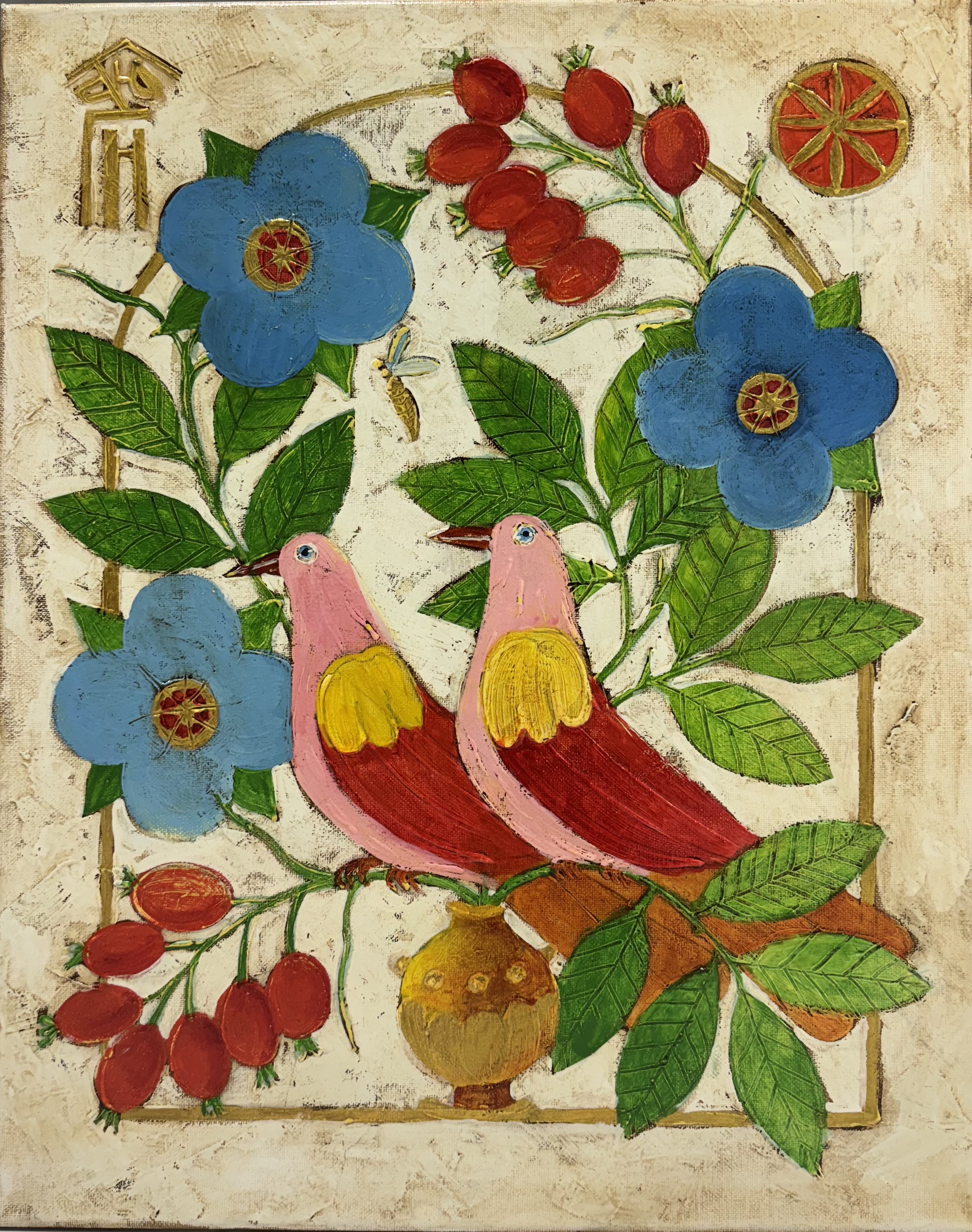 A beautiful scene in the center of which two pink-red birds with yellow wings have settled comfortably on a branch. They are surrounded by juicy green leaves, bright blue flowers and red fruits, perhaps rose hips or viburnum. The composition symbolizes pairing, harmony and love, as well as the unity of man with nature. The painting is made in the spirit of folk ornament, filled with light, warmth and joyful energy - it creates a feeling of happiness and security in the home space.