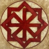 This is an image of a large red symbol in a circle - a solar sign resembling a star or a wheel. Such amulet was often used in Slavic culture to protect the home and family, symbolizing the sun, the energy of life, eternal movement. The painting is stylized as old plaster, the background is decorated with cracks and light ocher. This strict and laconic sign carries powerful energy, awakening the memory of deep roots and ancient traditions of ancestors.