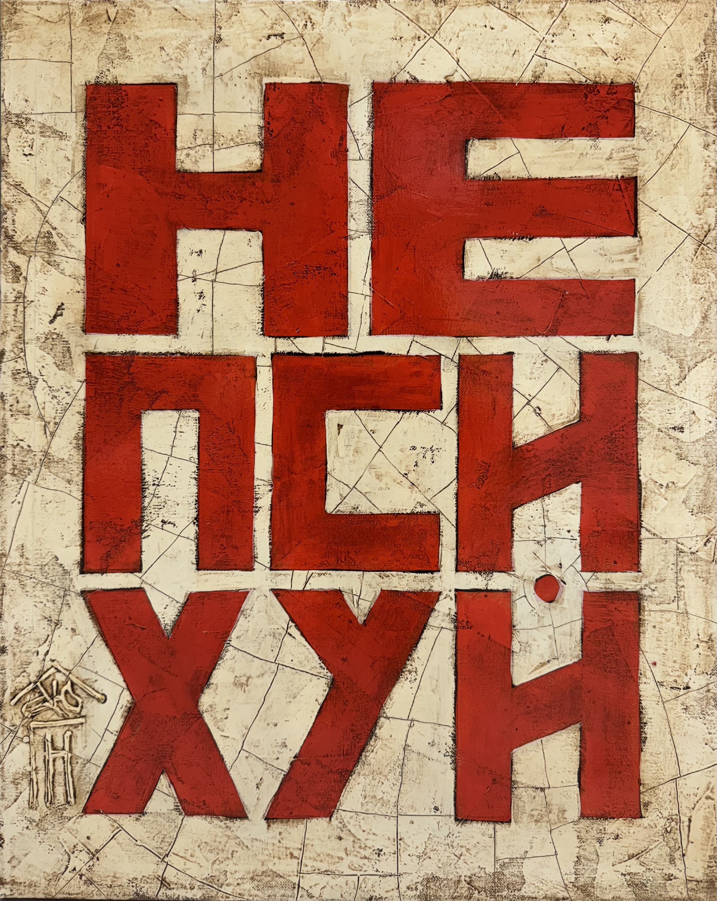 It depicts an inscription in large red letters in the style of ancient Cyrillic. The letters "Don't freak out" occupy almost the entire space of the canvas and have a massive geometric shape. The background is aged, covered with a network of cracks, which creates the feeling of an ancient artifact pulled out of the distant past. This design gives the message solemnity, making it a visual talisman against anxiety and worry, a kind of modern spell for inner peace. In the lower left corner is a recognizable sign of the artist, reminiscent of a Slavic amulet.