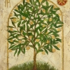 The center of the painting is occupied by a spreading stylish tree with a dense crown, covered with numerous round golden fruits. The foliage is lush, light and dark green, depicted against the background of an arched window, which creates the feeling of a temple of nature. In the upper corners there is a carved house sign and a solar symbol designed to protect and fill with energy. The tree is interpreted as a tree of life - a universal symbol of fertility, family well-being, the strength of the family and eternity.
