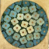 The central place in the composition is occupied by a circle completely filled with blossoming flowers of sky-blue, turquoise and milky shades. The flowers are tightly packed like a mosaic, creating a feeling of abundance, freshness and tenderness. Each flower has a pronounced center, which gives the entire composition decorativeness and rhythm. The background is golden-ocher, giving the work a refined ornamental character. This circle is a symbol of blossoming, harmony and the vitality of nature.