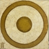 Minimalistic composition: a large central circle stands out against a light textured background, surrounded by a wider ring. The color scheme is warm terracotta and ochre, like clay or earth. The rings are emphasized by soft cracks, imitating ancient plaster or ceramics. This work is associated with eternity, the cyclical nature of life and the world order, reminiscent of ancient solar signs and mandalas.