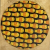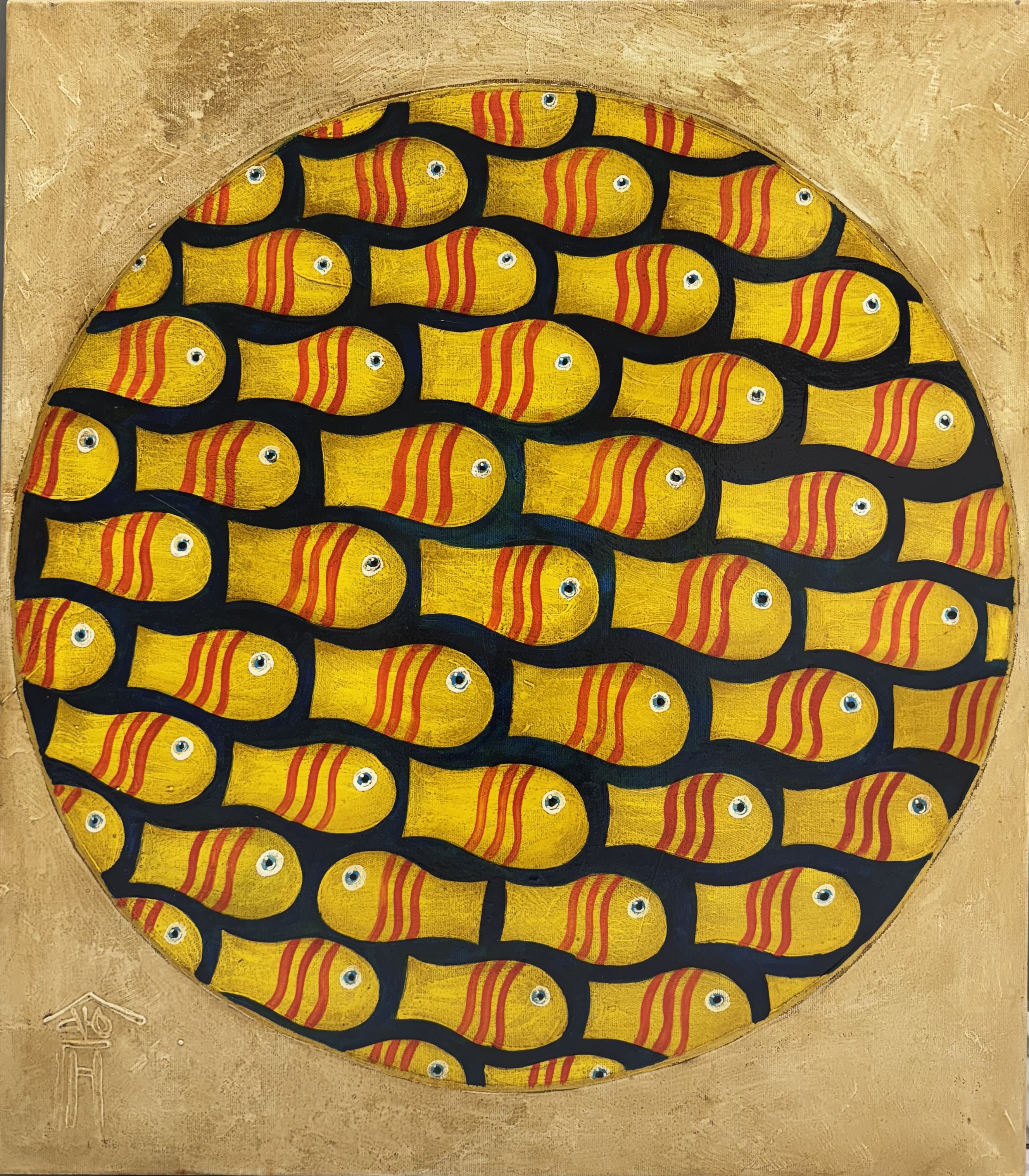 A pattern of yellow fish with red stripes is built in a circle, like a mosaic. Their bodies form a rhythmic row, as if the school is moving in one direction. Large round eyes give a slightly naive, good-natured expression. The painting is made in the style of an ornament or amulet, symbolizing wealth, harmony in life and well-being; the combination of black and yellow enhances the graphic expressiveness.