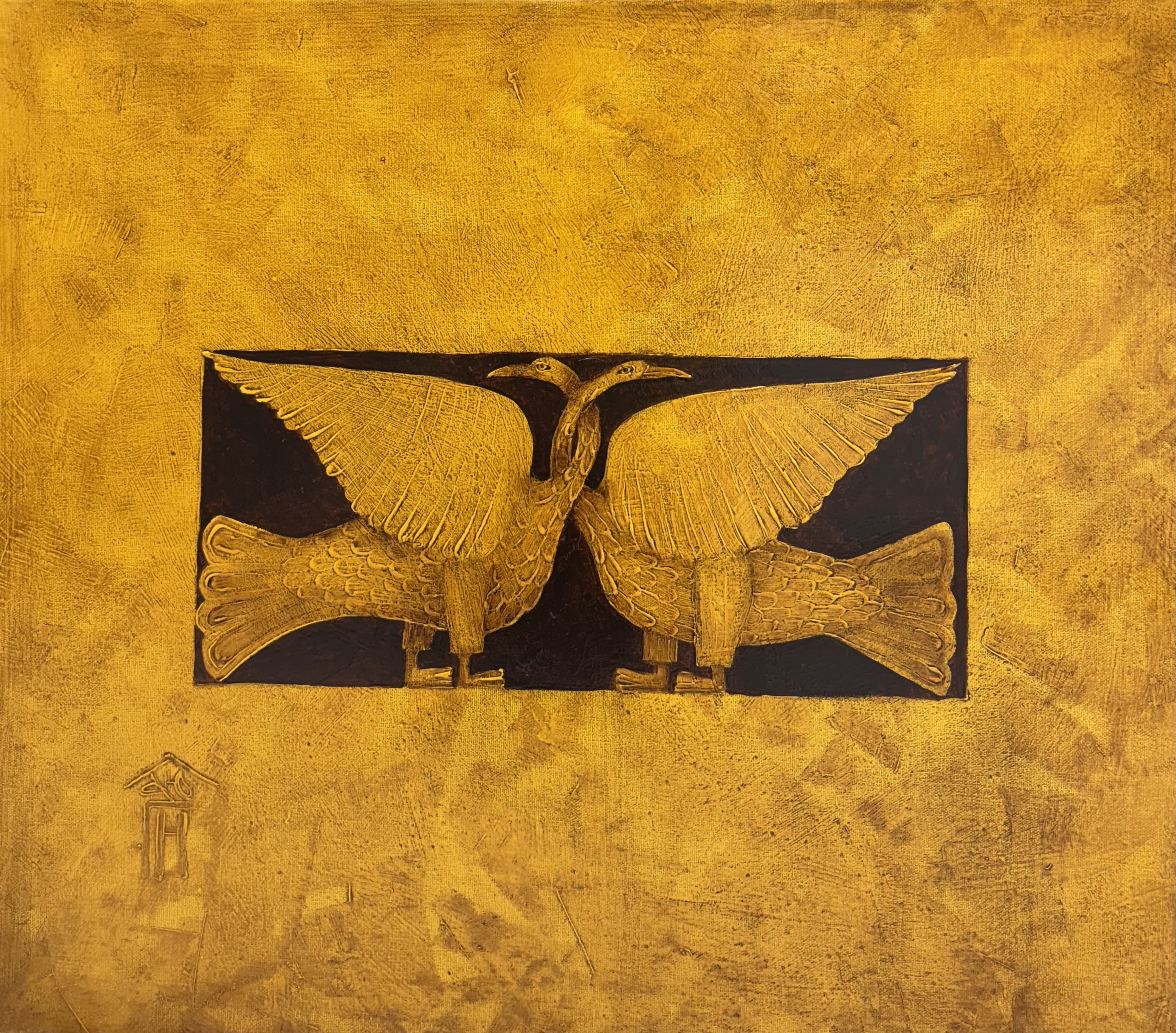 In this painting, two stylized birds, as if carved from gold, stand side by side in a black rectangle on a gold background. Their wings are spread and their heads are bowed towards each other, creating an image of ideal harmony and unity. The ornamental decorativeness of the lines calls to antiquity or ancient Russian art. The color palette - gold with deep black - creates a feeling of luxury, eternity and sacredness. The painting symbolizes union, fidelity, perhaps - marital happiness or a unique closeness of souls.