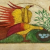 A bright and at the same time warm painting with a family motif. In the center are two birds, one of which is feeding at a nest with blue eggs, the other with brightly spread wings stands behind. Their plumage is a combination of yellow and red flowers with a relief ornament in the style of folk painting. In the background there is thick green grass, foliage and protective symbols of the sun, which gives the whole work a sense of the importance of the family, security, happy life and care for the offspring.