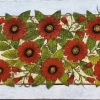 The long horizontal composition resembles a decorative border or frieze created on the motifs of folk arts and crafts. On a light background there is a rectangle densely filled with juicy red flowers with yellow centers - they can be recognized as rose hips or garden asters. Green leaves are densely intertwined between the flowers, and elongated rose hips are visible along the edges. The decorated frame, thin lines, repeating motifs create a rhythm similar to a woven pattern or embroidery. The composition is light, festive - like a fragment of a folk towel or a painting of a village house, the personification of the wealth and beauty of the native land, fertility and natural abundance.