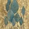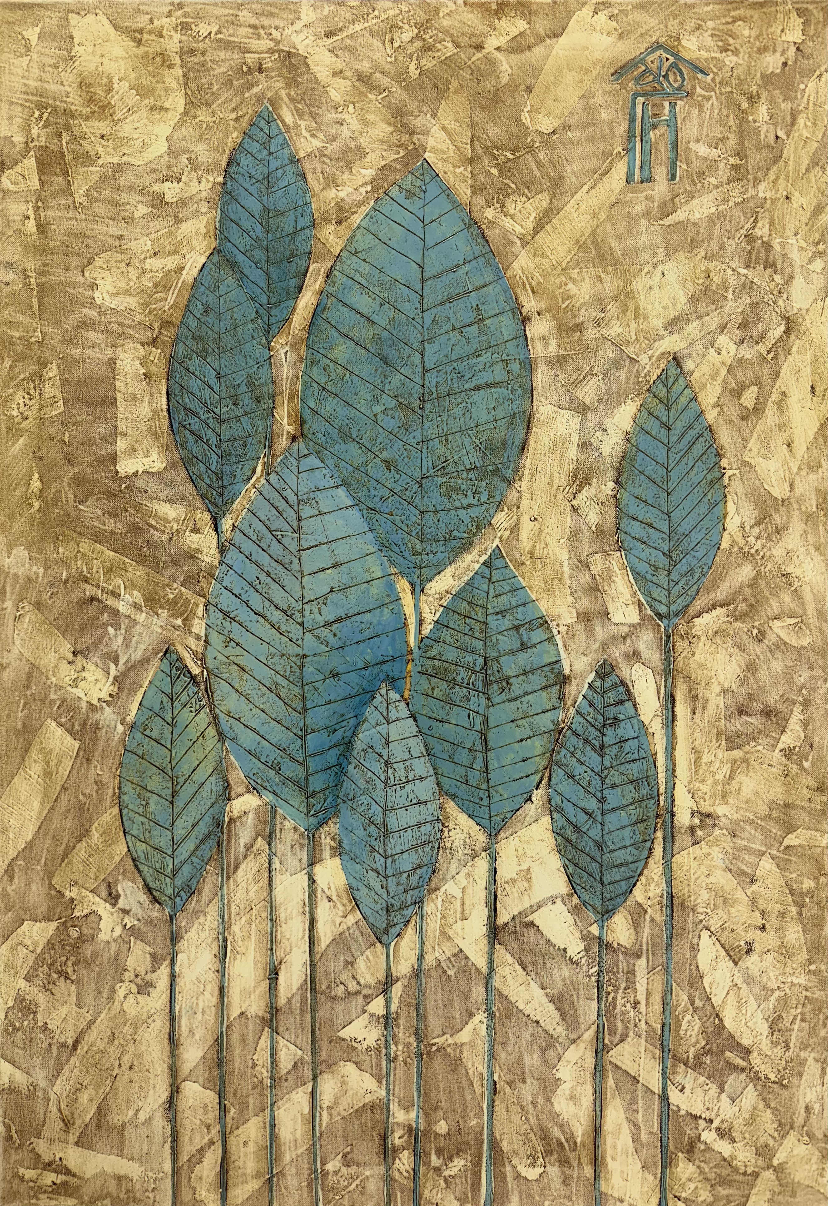 The painting features a composition dominated by a cluster of stylized leaves arranged against a textured, golden-hued background. The leaves, rendered in shades of blue-gray, stand out against the warm background, creating a striking visual contrast. The stylized nature of the leaves, with their simplified forms and repetitive patterns, lends a touch of folk-art charm to the artwork.