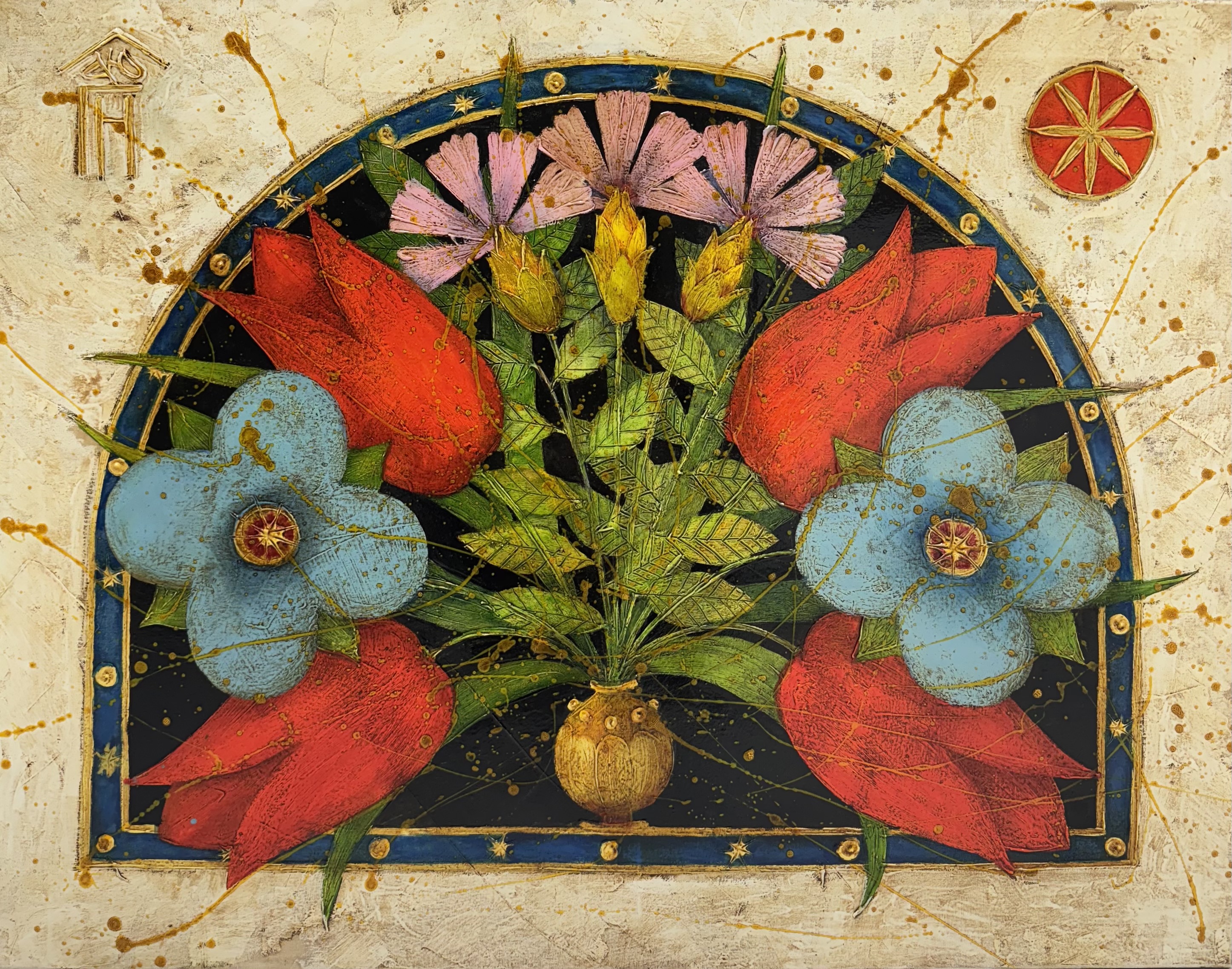 A special feature of the painting is the frame executed in the form of an arch or semicircle. The arch, like a portal to another world, creates a feeling of magic and mystery. Its dark color creates a contrast with the bright colors of the bouquet, emphasizing their beauty and expressiveness.