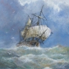 The canvas features an old sailing vessel in the center of the composition, struggling with a raging sea. Its tattered white sails are filled with wind, the masts and rigging are taut, reflecting man’s struggle with the elements. The waves around are multi-layered, powerful and vivid, rising in green and white, creating a sense of movement and tension. The indomitable elements seem almost alive, and the ship is a symbol of courage, hope and fortitude in the face of the storm. The sky is filled with a deep blue hue with snow-white thunderclouds, like a dramatic backdrop to the scene of the struggle.