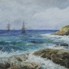 The painting depicts a seascape with a view of coastal cliffs and three sailing ships sailing on a calm blue sea. The water here is calm, but full of movement - white foamy crests roll onto the rocks, splashing. In the distance, sails stand proudly, as if heading towards the horizon, and a light misty cover creates a feeling of morning freshness or an approaching change in the weather. The whole scene is filled with the grandeur and freedom of the open sea, inviting the viewer to travel and dream of distant shores.