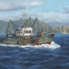 The painting reveals a scene of sea fishing and marine life: an old but sturdy fishing vessel confidently plows through the waves of a dark blue sea near a coastline outlined by rocky mountains. The ship, with rusty spots and worn paint, flies the Russian flag on its masts and is surrounded by ever-hovering seagulls, which accompany pike-perch in the hope of catching the thrown-out catch. The water around the vessel foams and plays with reflections of light, evoking a feeling of movement and noisy splashing. The sky under gloomy but calm clouds promises a change in the weather, but the icebreakers continue their work, symbolizing fortitude and tenacity.