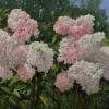 This painting is an exquisite still life dedicated to the beauty of blooming hydrangeas. Lush inflorescences, made in shades of white and delicate pink, seem to come to life against the background of dense green foliage and forest. Each flower is carefully drawn, conveying their airiness and lightness. Bright lighting and a soft blue sky add freshness and harmony to the canvas. The painting amazes with its natural beauty and the peaceful atmosphere of a spring or summer garden, reminding us of the wonders of living nature and its continuous renewal.