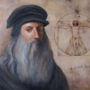 The painting is a solemn and profound portrait of the great Leonardo da Vinci. The artist's skill managed to convey not only the facial features, but also the inner world of the genius - the mind and wisdom that were comprehensively manifested in Da Vinci's work. The look is penetrating, thoughtful, as if the artist is thinking about the next discoveries. In the background is one of Leonardo's most famous sketches - "Vitruvian Man", symbolizing ideal proportions and harmony in nature and art, emphasizing the connection between scientific and artistic approaches. The signature with the name adds historical accuracy and significance to the portrait.