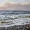 The painting depicts a calm seascape in the pre-dawn or evening hours, when the sea is only slightly rough. The sky is graduated in soft pastel tones - pink, purple and blue, reflected in the water. Small waves with foamy edges gently roll onto the rocky shore, where smooth sea pebbles sparkle with wet edges. In the distance, the horizon seems to be washed away in the fog, giving the painting a dreamy and peaceful feel. This is a quiet moment of harmony between water and sky, which calls for meditation and tranquility.