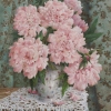 The painting is a tender and romantic still life with a bouquet of peonies. The rich pastel pink flowers seem airy and soft, their multi-layered petals are drawn with amazing care, conveying their velvetiness and splendor. The flowers are collected in an elegant porcelain vase with a small floral pattern, which stands on a table covered with an openwork white lace tablecloth. The background is made in greenish-turquoise tones with a decorative pattern, creating an elegant and calm entourage. A couple of fallen petals on the table add liveliness and a sense of fleeting beauty.